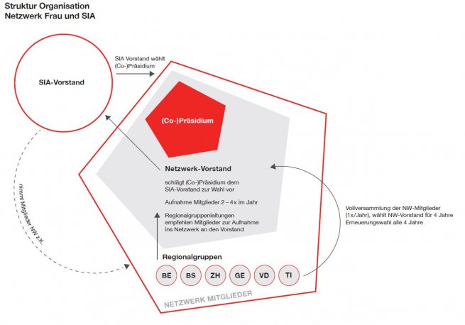 Le réseau «femme et sia» a été constitué le 27 juin 2014. Il est organisé pour l’ensemble de la Suisse et par groupes régionaux, et dispose d’un comité directeur avec différents ressorts ainsi que d’une présidente et d’une vice-présidente. Les groupes régionaux lancent, conduisent et réalisent les tâches et les projets en accord avec les objectifs fondamentaux du réseau «femme et sia» et de la SIA. Chaque groupe régional dispose d’une responsable et d’une responsable adjointe, et délègue un à trois membres au comité directeur du réseau. L’ensemble du réseau, c’est-à-dire tous les groupes régionaux, se réunit au moins une fois par an en assemblée plénière. Le principe de base est celui du volontariat.